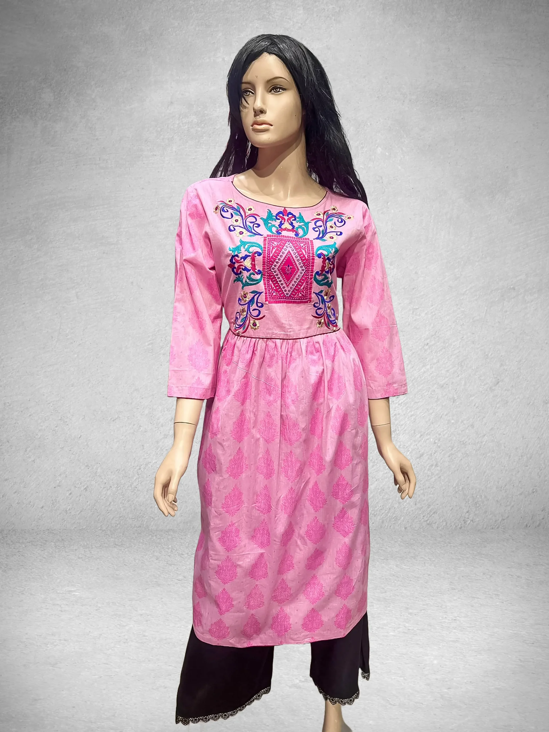 কাজের ধরন: অল ওভার স্ক্রিন প্রিন্ট ও এম্ব্রয়ডারী করা। ড্রেসে মেরুন কালাটের কট পাইপিন ব্যবহার করা হয়েছে।
