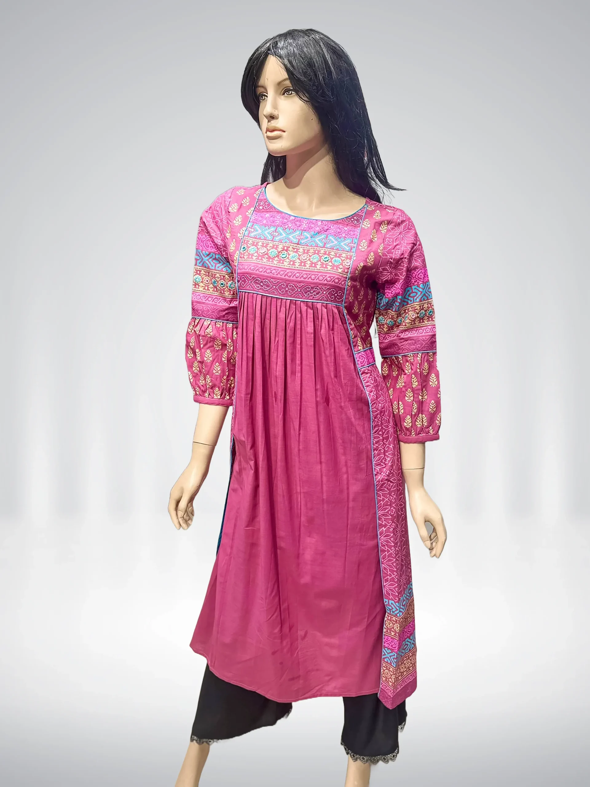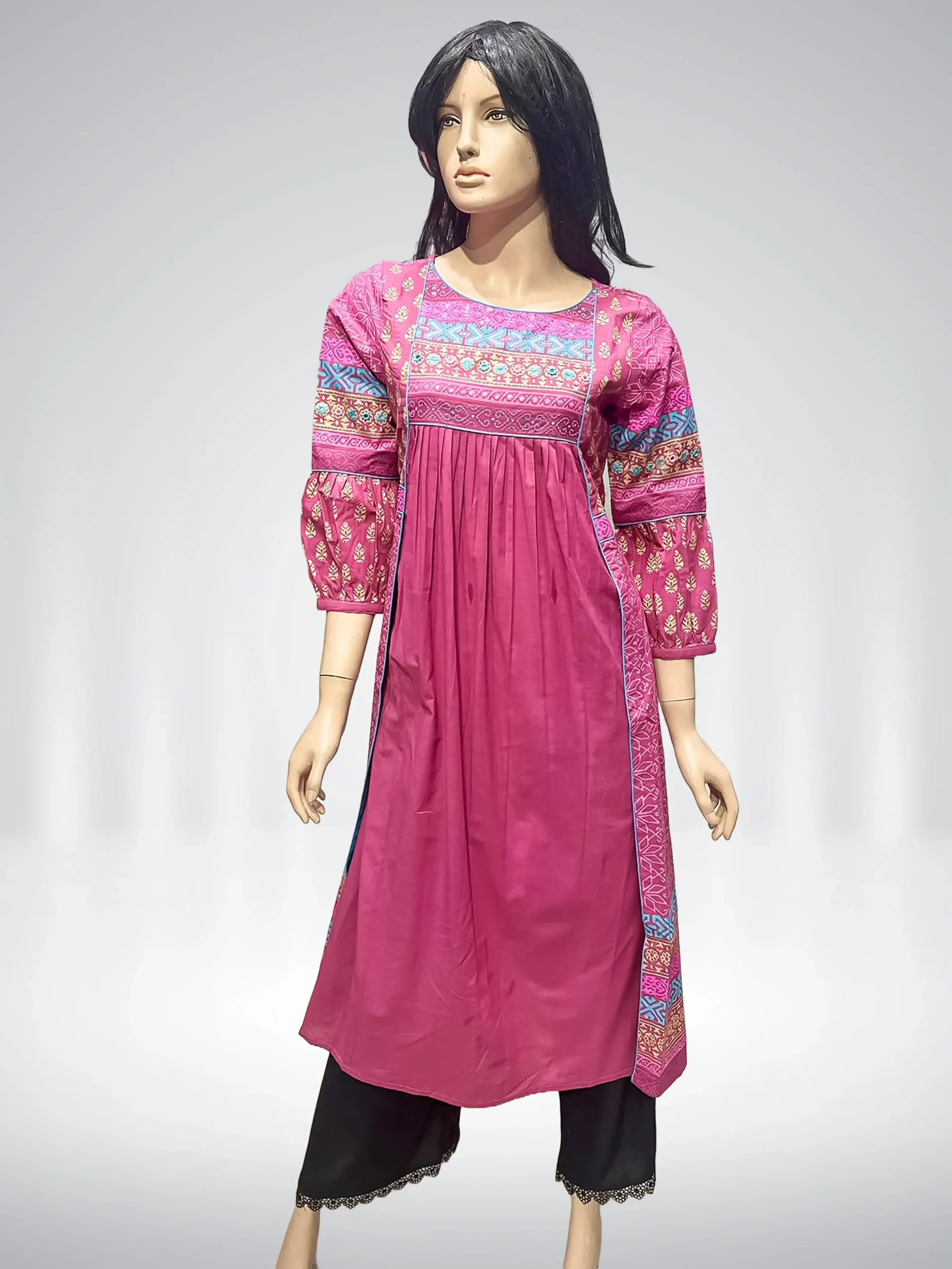 কাজের ধরন: অল ওভার ব্লক প্রিন্ট করা। হাতে সেলাই কাজ করা ও ডলার চুমকি বসানো। ড্রেসে কট পাইপিন ও কুচি ব্যবহার করা হয়েছে।