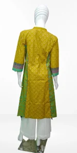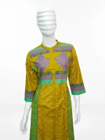 কাজের ধরন: ফিস কাট ড্রেসটিতে অল ওভার কয়েকটি কালারের ব্লক প্রিন্ট করা ও হাতে সেলাই করে চুমকি বসানো হয়েছে।ড্রেসেটির মাঝামাঝি বাটন প্লেটের মতো করা হয়েছে। আকর্ষনীয় করতে কট পাইপিনও ব্যবহার করা হয়েছে।