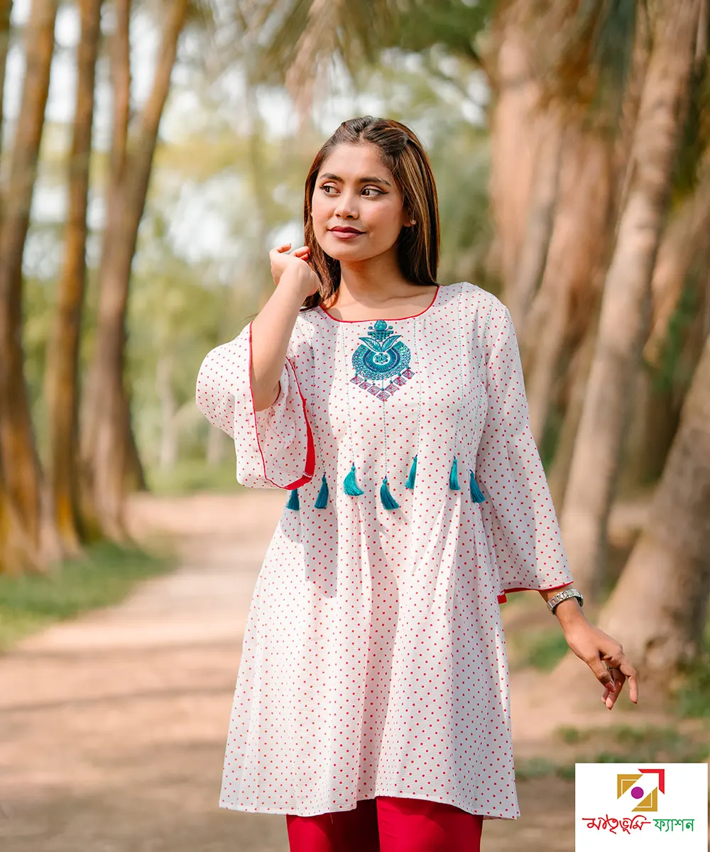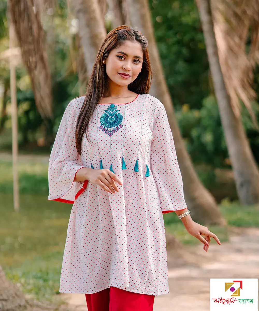 ☛ সাদার মধ্যে লাল ডট প্রিন্ট জর্জেট ফেব্রিক্স।