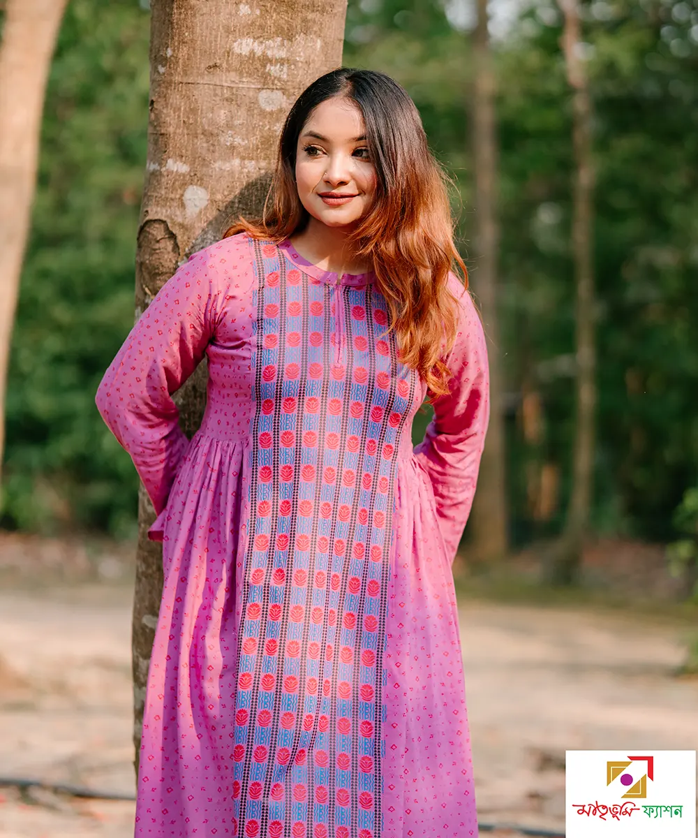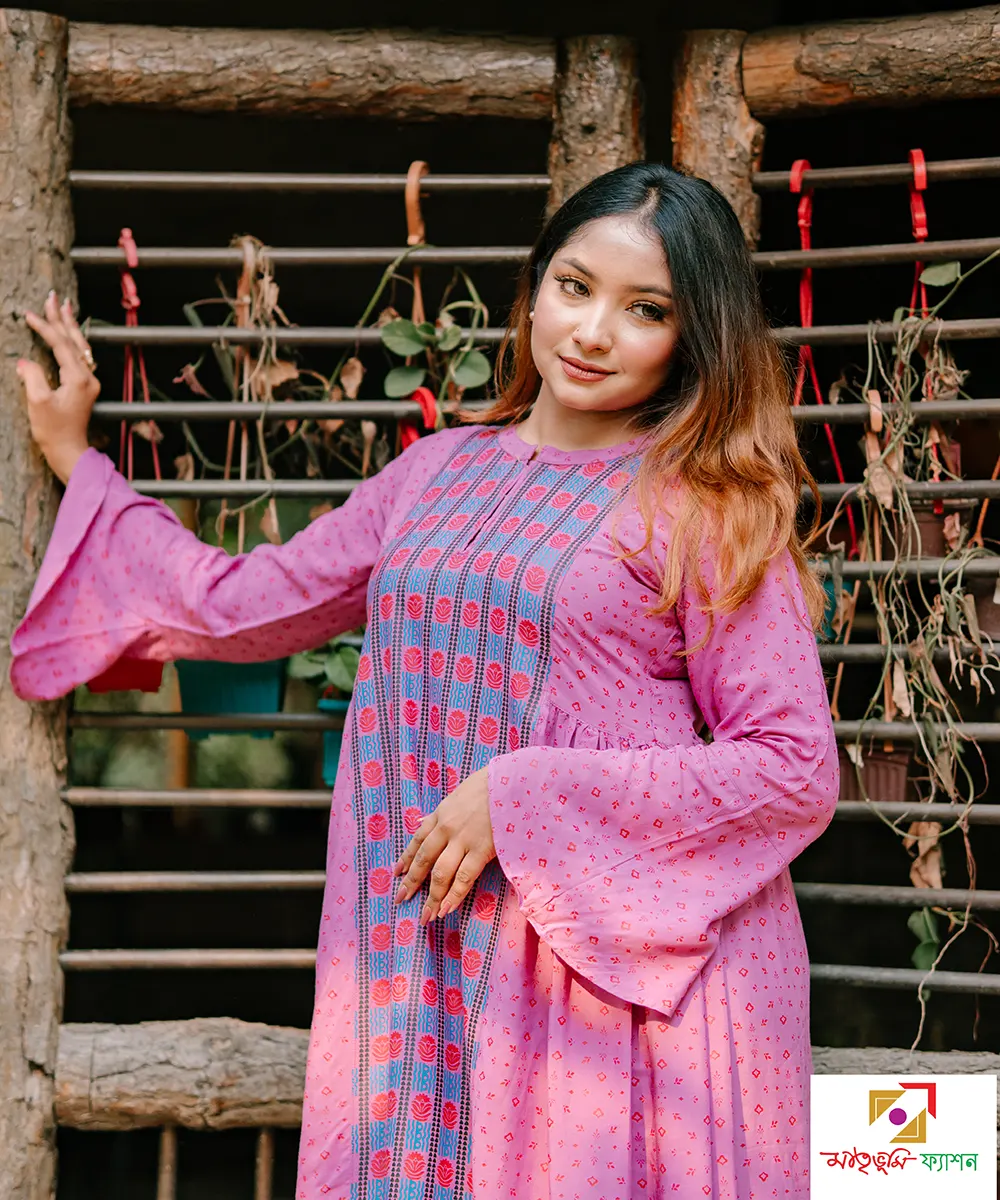 ☛ স্ক্রিন প্রিন্টের প্যানেল বসিয়ে হাফ বডির দুই পাশে কুচি করা রয়েছে।
