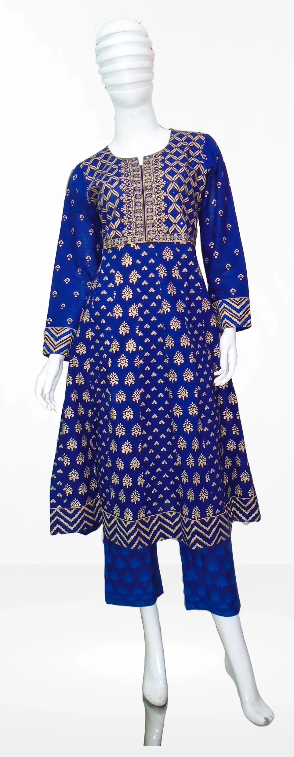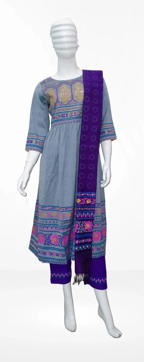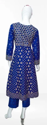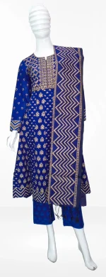 কাজের ধরন: অল ওভার আফসান কালারের ব্লক প্রিন্ট করা ও গোল্ডেন জরি সুতা দিয়ে এম্ব্রয়ডারি কাজ করা। হাতে সেলাই করা চুমকির কাজ রয়েছে।ড্রেসেটি আকর্ষনীয় করতে কট পাইপিন ও কলি কাট করা হয়েছে। ব্লু তাত কটনের সলোয়ার ও হাফ সিল্ক ওড়নায় ব্লক প্রিন্ট করা।