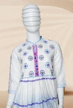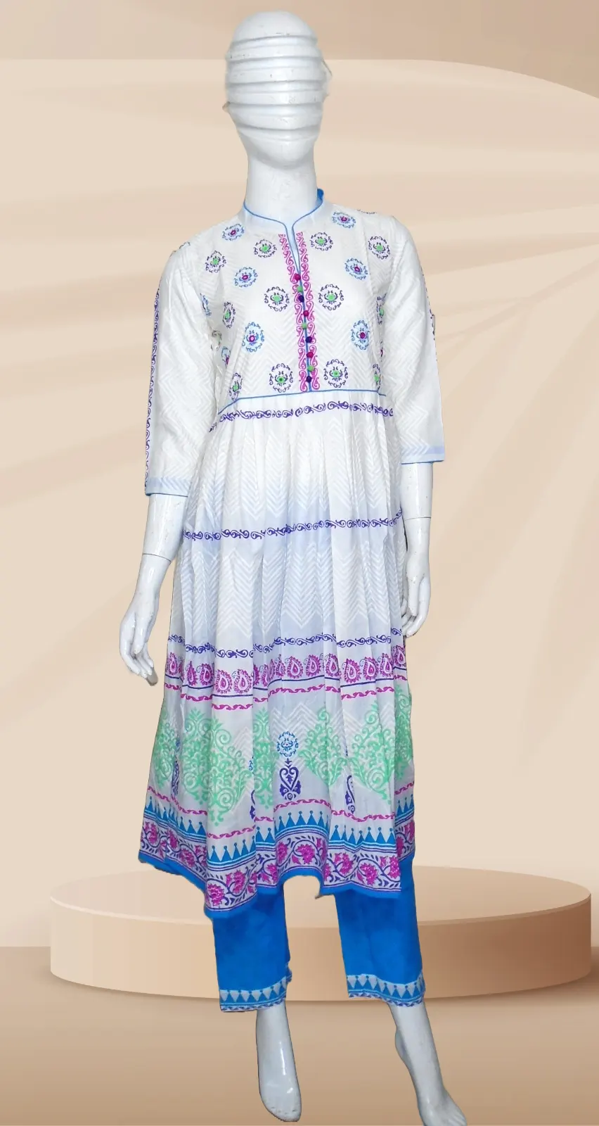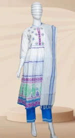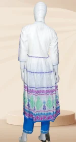 কাজের ধরন: ফ্রক কাটিং ড্রেসে অল ওভার ব্লক প্রিন্ট, এম্ব্রয়ডারী ও হাতের কাজ করা। ড্রেসে পাইপিন ও কুচি ব্যবহার করা হয়েছে। তাত কটন সালেয়ার ওড়নায় ব্লক প্রিন্ট করা।